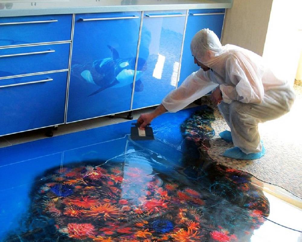 Проявите фантазию и сделайте красивый наливной пол с картинками своими руками. 3D покрытие создаёт эффект объёмной фотографии. Для такого эффекта после грунтовки наносится слой основного цвета. После грунтовки сделайте изображение, оно создаётся именно для данного полового покрытия. 3D изображение наносится кистями, аэрографией, красками или с помощью плёнки.