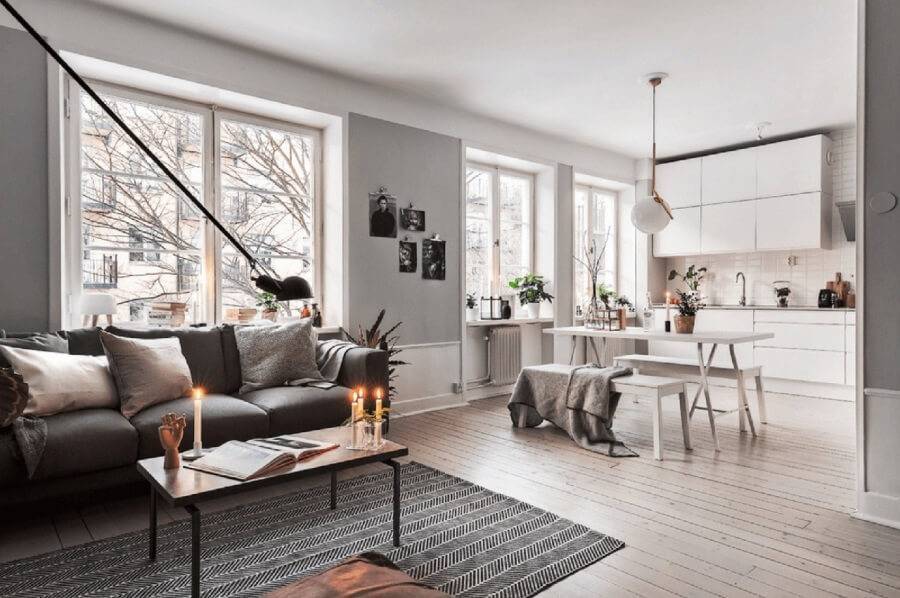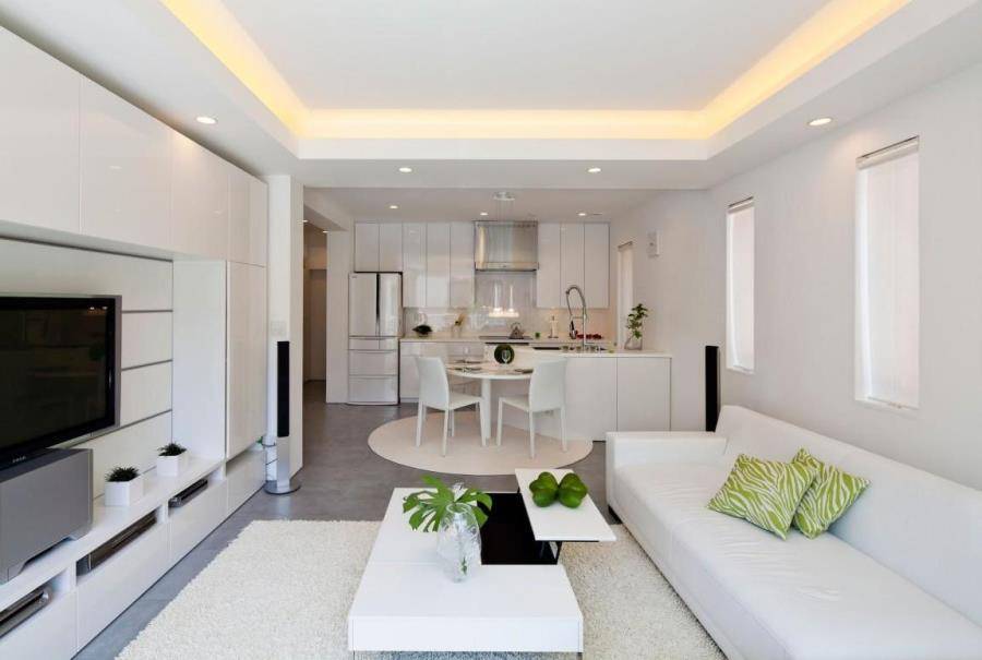 Необычное впечатление производит кухня-гостиная, чей дизайн выполнен в скандинавском духе. Это направление активно применяет белый цвет при работе с поверхностями, что позволяет зрительно увеличить высоту и ширину комнаты. Верхнюю часть шкафов лучше подсветить встроенными светодиодами, чтобы потолок казался выше.