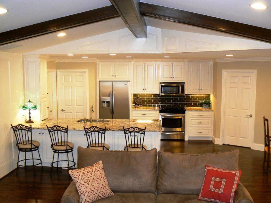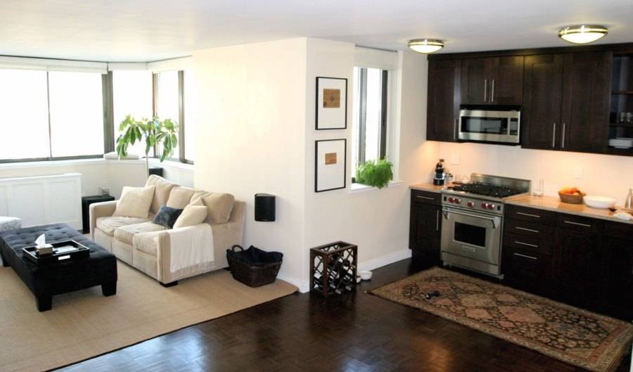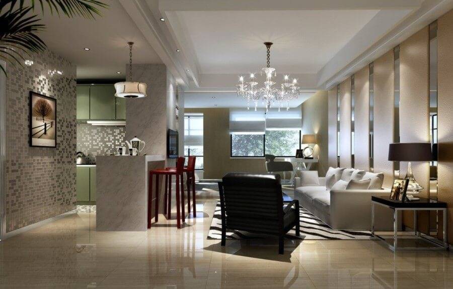 Современный интерьер кухни позволяет единое совмещение с комнатой. При выбранной планировке помещение становится удобным для проживания. Если между комнатой и кухней нет стены, то проводится распределение зон. Их варианты подбираются под потребности жильцов.