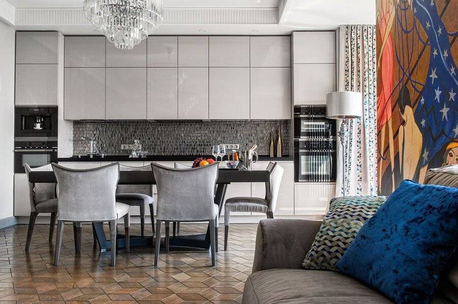 Кухонный гарнитур с белоснежными лаковыми панелями вступает в контраст с покрытием столов и стойки, которые покрашены черным. Фартук должен быть с необычным геометрическим узором, зеркальные детали с подобным изображением могут украшать дверцы. Кресла и диван подбирают светлых тонов, а шкафчики и другую мебель – темных.