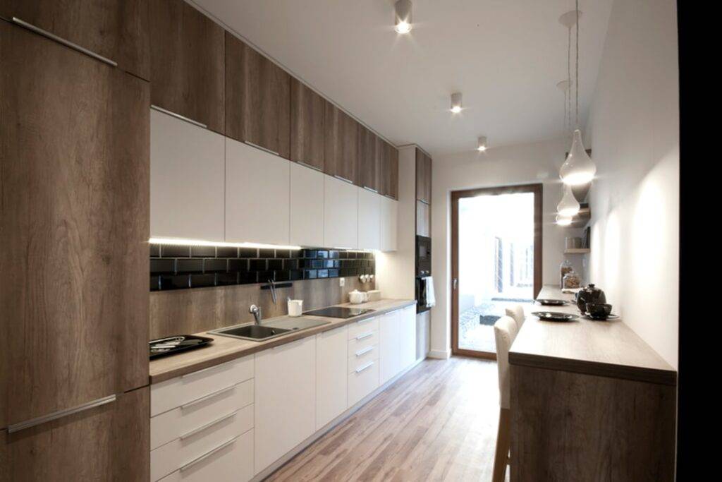 Что касается планировки, это могут быть прямые, угловые, а также современные кухни с барной стойкой или островом.