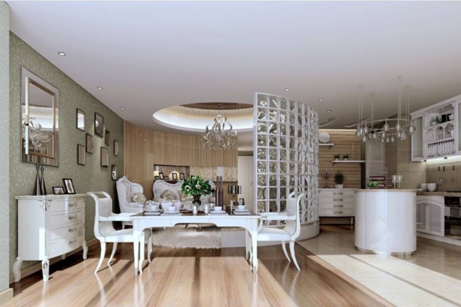 Идеальный способ зонирования пространства для тех, кто хочет получить максимально открытое место без глухой стены, и в то же время сохранить возможность уединиться на кухне. Перегородки могут быть как из гипсокартона, так и стеклянными.