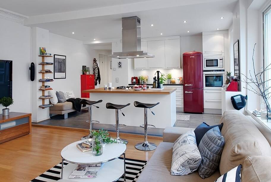 Несмотря на то, что дизайн гостиной и кухни в квартире-студии должен сохранять одинаковые черты, важно грамотно провести разделение пространства на зону отдыха и место приготовления пищи. Сегодня для зонирования кухни студии используют сразу несколько приемов