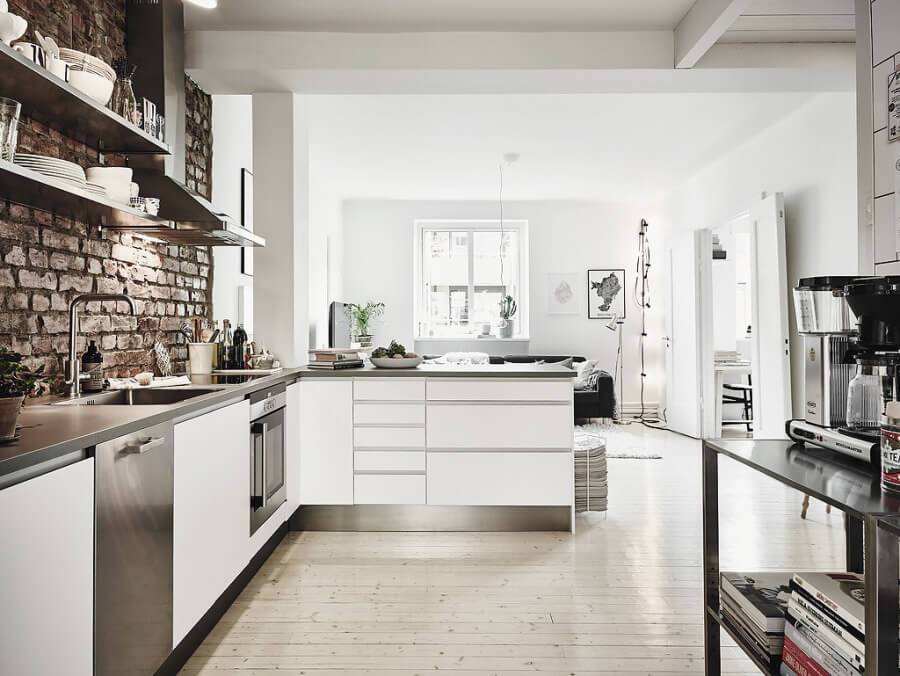 Скандинавская «трансформация». Элементы стиля в современном исполнении неплохо сочетаются с другими направлениями. К примеру, использование дерева и грубой отделки, теплые яркие оттенки вместе с более темными, — ведут к менее «холодному» результату. Они оптимально вписываются в рамки кухни «будущего».