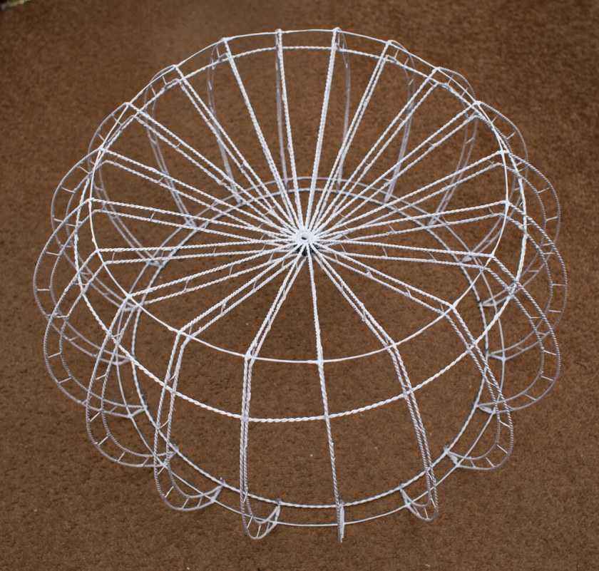 - Готовые фрагменты зачистить от неровностей и ржавчины наждачной бумагой; используя круглогубцы и пассатижи, придать им нужную форму. Классический каркас – это два круглых основания разного диаметра и 4-6 ребер.
