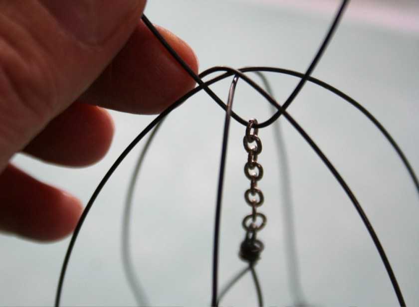 - На верхнем конце каждого отрезка проволоки для изготовления ребер сделать небольшую петличку и продеть их в верхнее кольцо каркаса. Распределить на одинаковом расстоянии.