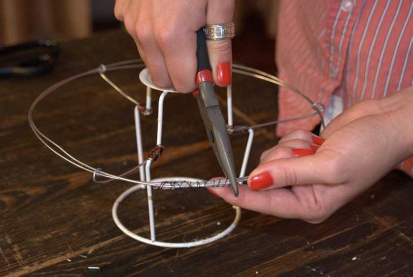 Что касается проволоки, то ее не стоит экономить при оплетке. Иначе идея как сделать каркас для абажура своими руками обернется неудачей, т.к. сам каркас в отдельных местах будет «играть». То же самое касается крючков.