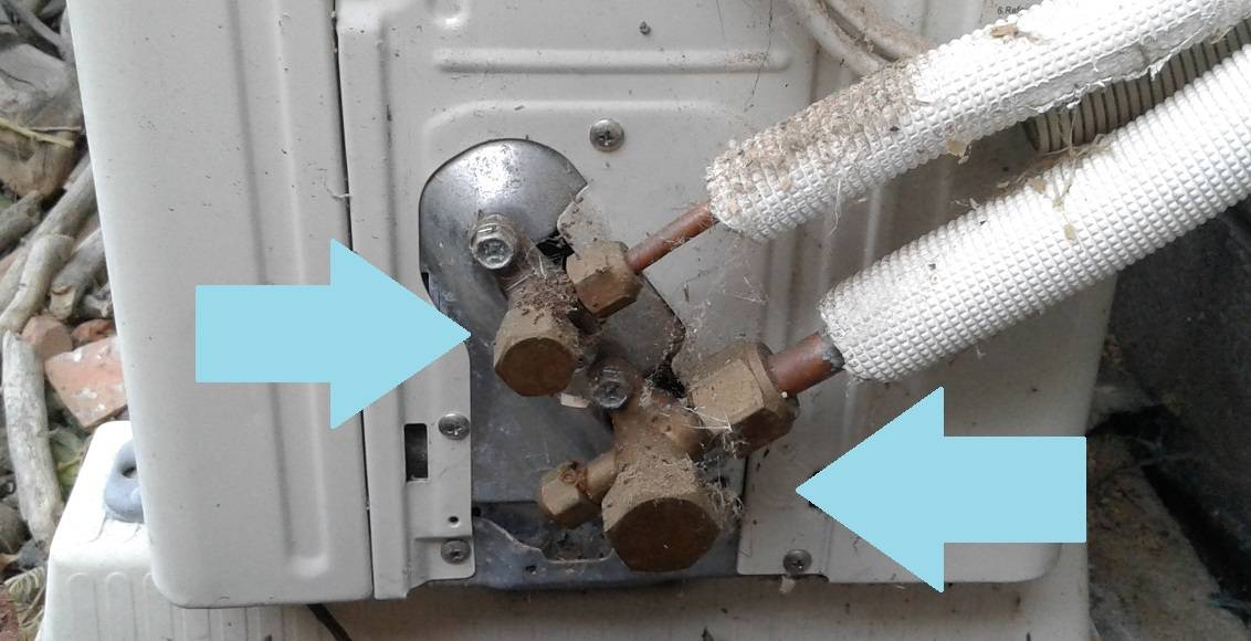 Если на сервисных вентилях нет конденсата и их температура не изменилась – фреон полностью ушел из кондиционера. Если же на поверхности вентилей образовался иней, лед – в системе недостаточно хладагента. Наледь образуется по той же причине, что в наружном блоке.