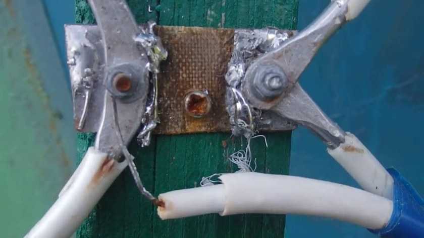Для установки готовой конструкции можно воспользоваться любой палкой, металлической трубкой или даже стеной дома. Главным условием является отсутствие контактов между металлическими элементами и креплением. То есть, использование шурупов допустимо, но требуется следить за их расположением.