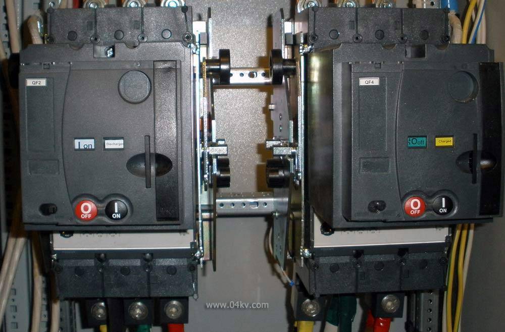 - Если обратный переход не допустим по условиям сети. Например, при питании сети аварийного освещения от сети постоянного тока, либо при несинхронности работы автономного генератора, то в этом случае должна быть предусмотрена механическая блокировка. Она должна обеспечить обратный переход только с перерывом питания.