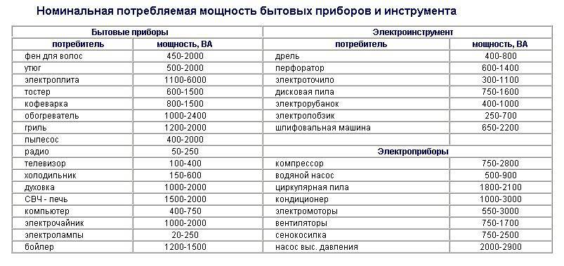 Таблица мощности бытовых приборов и инструментов
