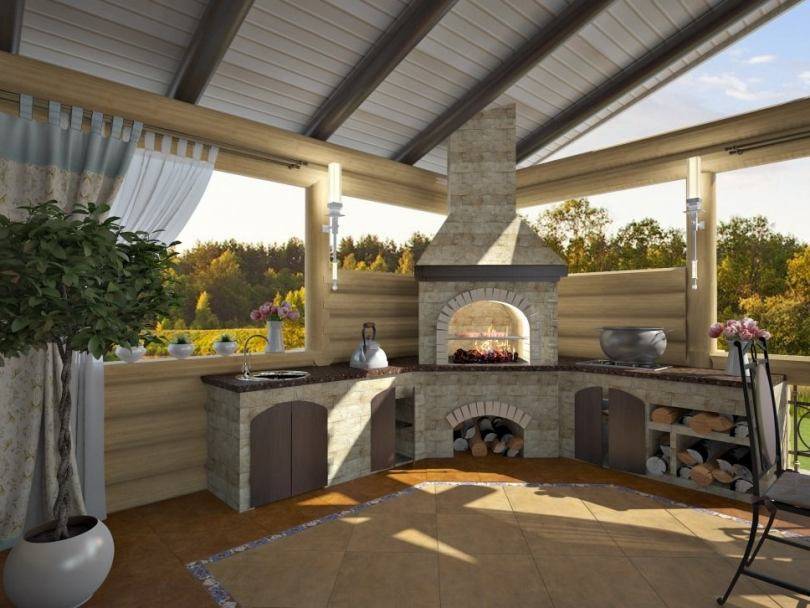 Интересный проект бани с открытой террасой и отдельным помещением для хранения дров. В качестве основного материала для возведения может послужить брус, бревно или кирпич.