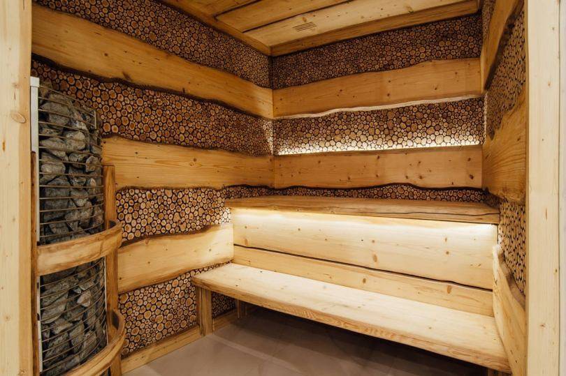 Потрясающий банный ансамбль в загородном особняке. Его строительство обойдется в немалую сумму, но если владелец может себе это позволить, то будет иметь в своем распоряжении оздоровительный комплекс в миниатюре. Стены изнутри отделаны доской из натуральной древесины — в парной использована душистая и целебная липа. В помывочной стены в душевой зоне и бассейне выложены полированным камнем.