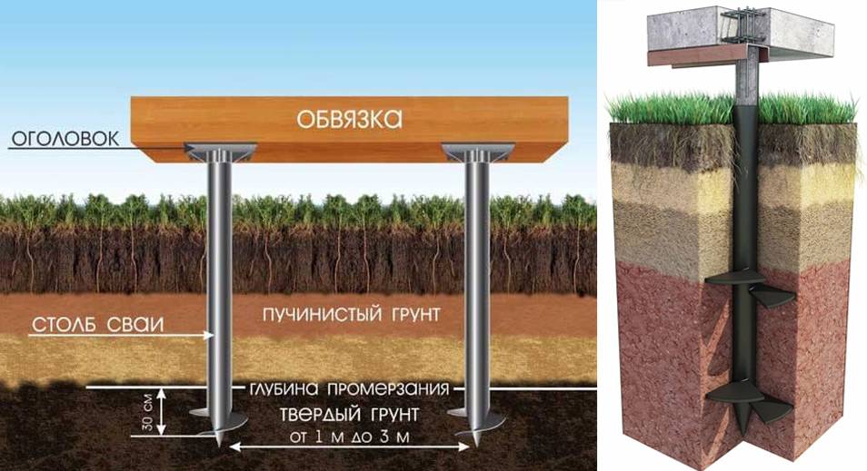 Отличительной чертой подобного основания является то, что опоры изготавливаются из металлической трубы с наконечником. Он имеет лопасти. Такой устройство свай дает возможность закручивать опоры в грунт без разрыхления почвы. Так опоры получают стабильное положение.