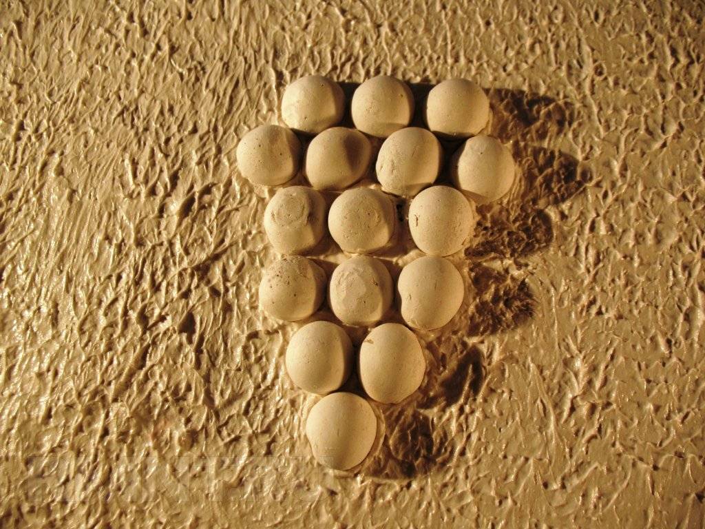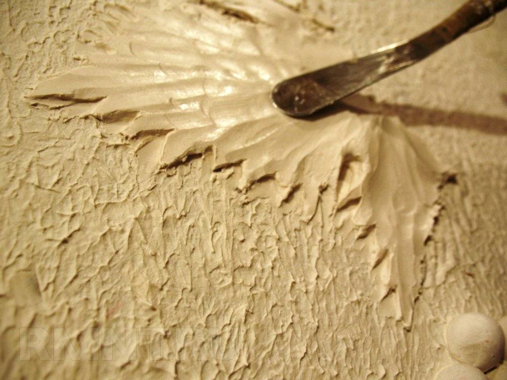 Первый этап создания объемного барельефа своими руками на стене – выполнение композиции в полный размер и перенос очертаний на место будущей картины. Набросок переносят путем прорисовки по пленке (выполняют маркером). На подготовленную стену наносят основу тонким слоем. Полиэтиленовое полотно располагают в необходимом пространстве и закрепляют, контуры зарисовки обводят. Образец удаляют, а очертание остается на поверхности. Контуры также переносятся на сухую плоскость. В этом случае после закрепления пленки сверху край ее поднимается, и линии прорисовываются обычным грифельным карандашом.