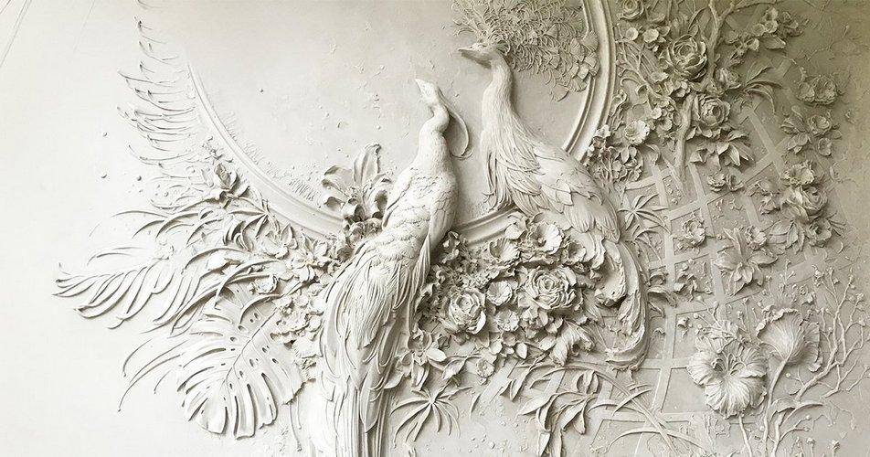 - Художественная гипсовая лепнина по месту, т.е. непосредственно на опорной поверхности. Требует основательных навыков, но дает возможность создавать большие рельефные панно во всю стену, с обводом углов, заходом на потолок, и полную свободу творческого самовыражения.