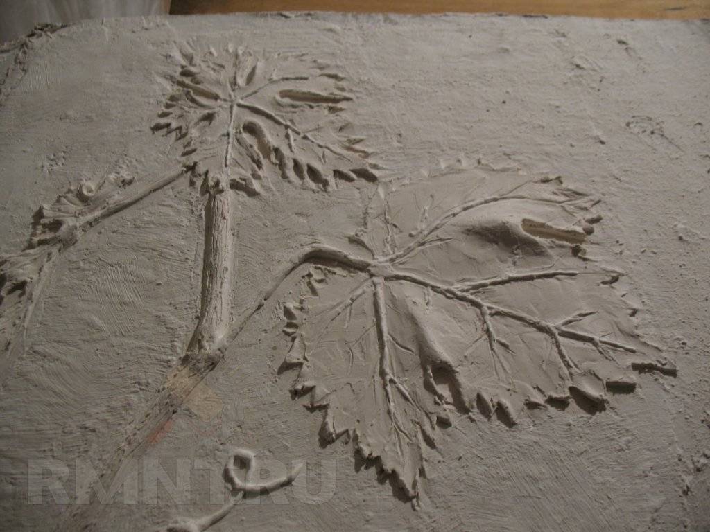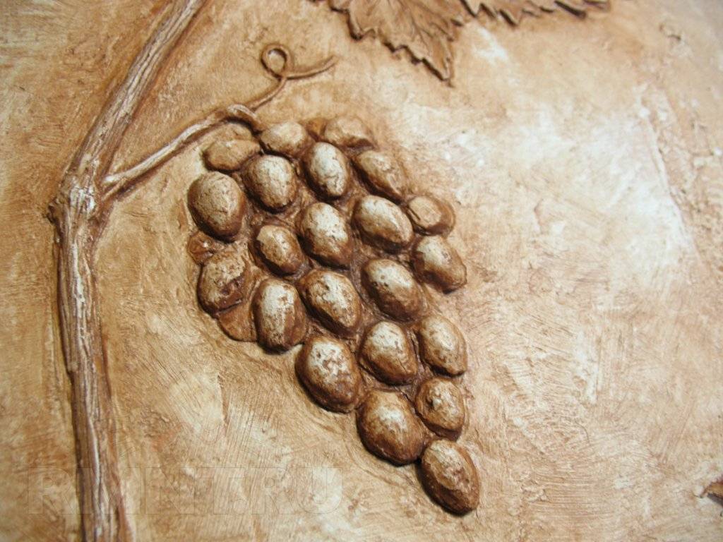 Рассмотрим, как сформировать барельеф на стене своими руками на примере производства изображения виноградной лозы с гроздью, фигурными листками. Работа выполняется методом исполнения различных частей из алебастровой смеси с последующим их закреплением на стене. В формы отливаются ягоды и листочки, витиеватый стебель и усики прорисовывают вручную. При производстве крупных тяжелых частей используют для армирования и облегчения крепления на стене остов из проволоки.