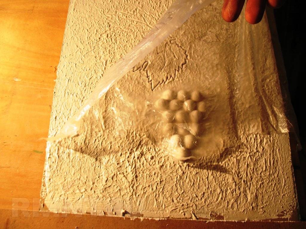 Второй пункт исполнения барельефа – изготовление формы для листочков и виноградных ягод. Рассмотрим исполнение матрицы из герметика с наполнителем (тальк/крахмал). На доску насыпают наполнитель и замешивают с герметиком как обычное тесто. Предмет соответствующей фигуры (овал или шар) и размера вдавливают в полученный материал. После застывания силикона образец извлекают. Получается матрица для формирования ягод. Для листков можно воспользоваться фабричной силиконовой/полиуретановой матрицей, или изготовить шаблон самостоятельно указанным выше способом. Образец формы листочков для барельефа лепят из пластилина или соленого теста.