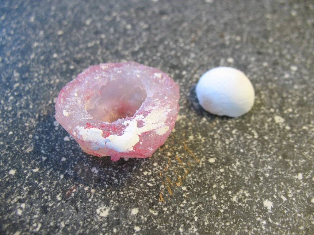 Из застывшей формы достаём пластилиновую конструкцию. На основе такой технологии, изготавливаем нужное количество виноградинок.