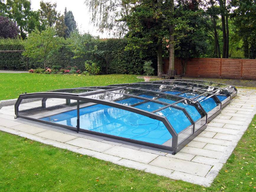 Кроме устройств водоподготовки, не лишним будет и раздвижной навес для бассейна из поликарбоната. Этот изящный павильон защитит воду от загрязнений и создаст в жаркий солнечный день приятный теневой занавес.