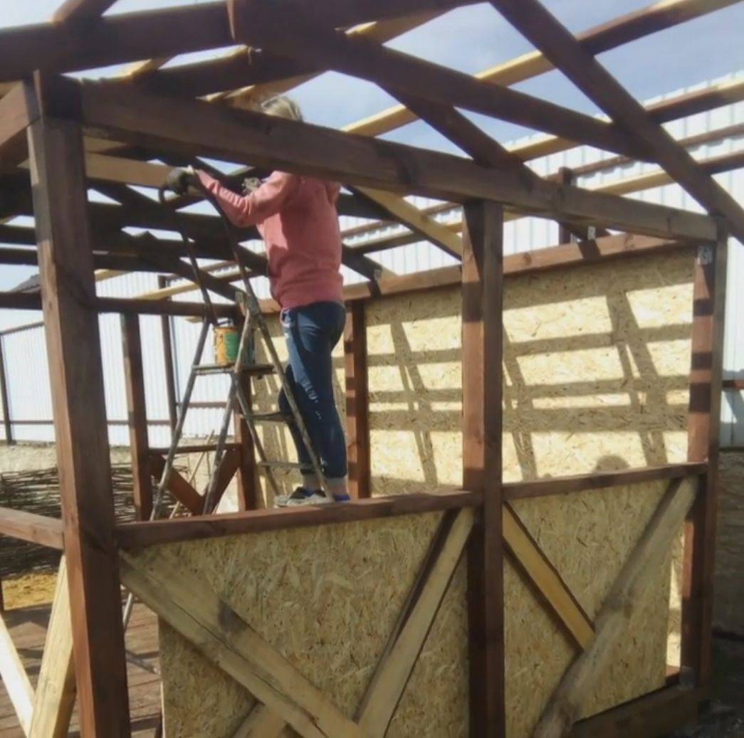 Готовый каркас крыши теперь можно разобрать и покрасить каждый элемент антисептиком (например, пропиткой для дерева «Пинотекс» или аналогичной), устойчивым к воздействию атмосферных осадков, солнечных лучей и перепадам температур.
