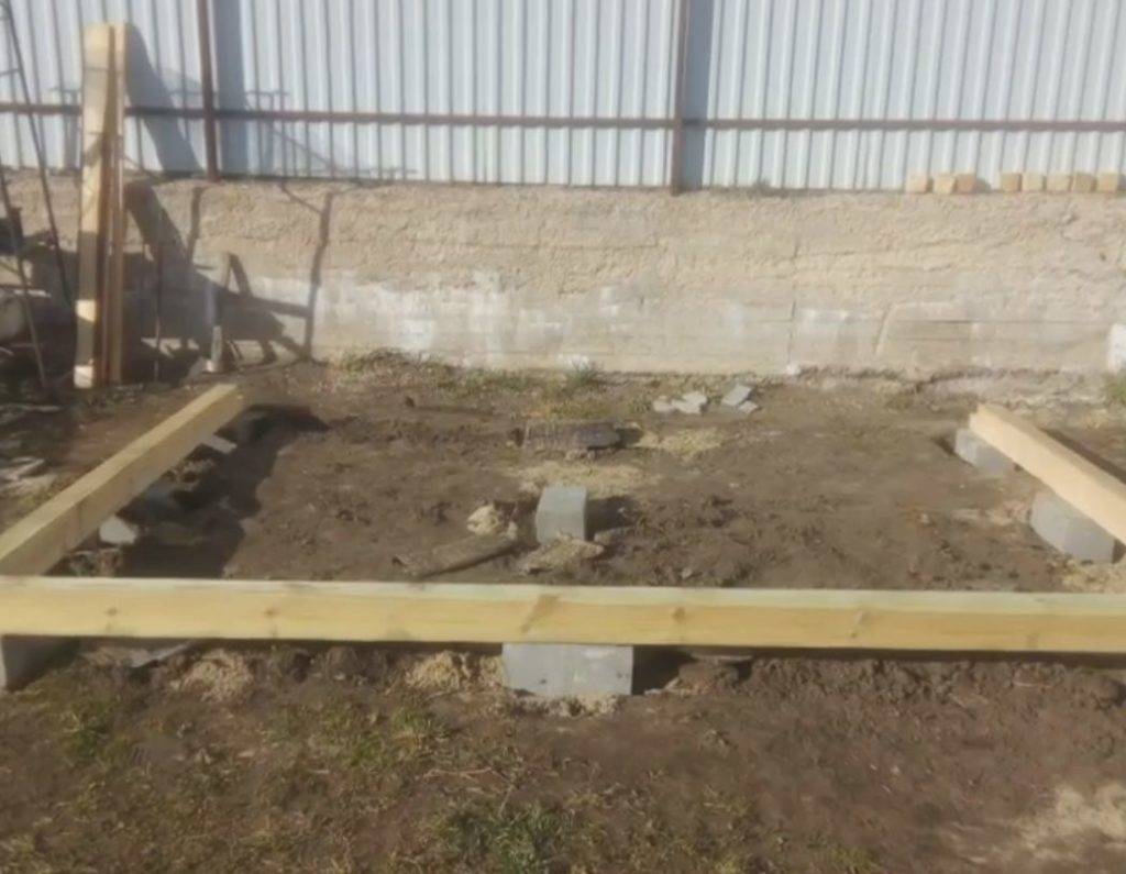 Предварительно собираем нижнюю обвязку, расположив ее на столбиках основания