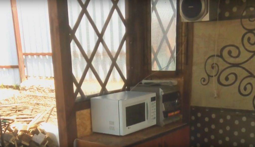 Дополнительно внутри постройки было проведено освещение, установлены телевизор и микроволновка. В итоге получилось практически жилой домик для отдыха.