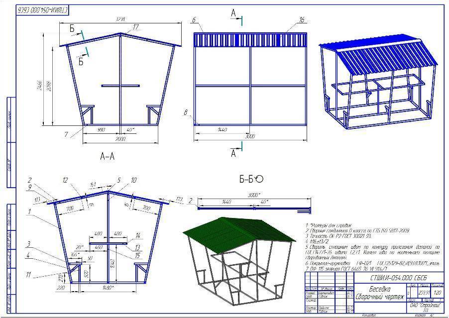 Принципиальных отличий между тем, как сделать беседку из профильной трубы, нет. В первую очередь, выполняется чертёж будущего строения с отражением конкретных габаритов, нанесением всех конструктивных элементов.