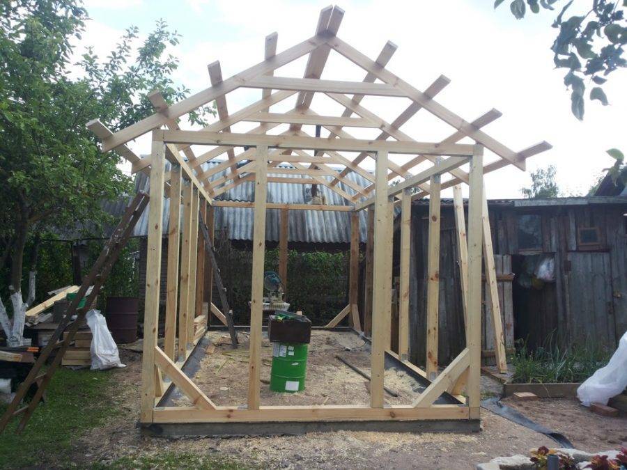 - Каркасную основу для возведения хозпостроек можно сделать из деревянных брусков или металлических труб. Именно к ним и будут прикрепляться поддоны в один или два слоя.