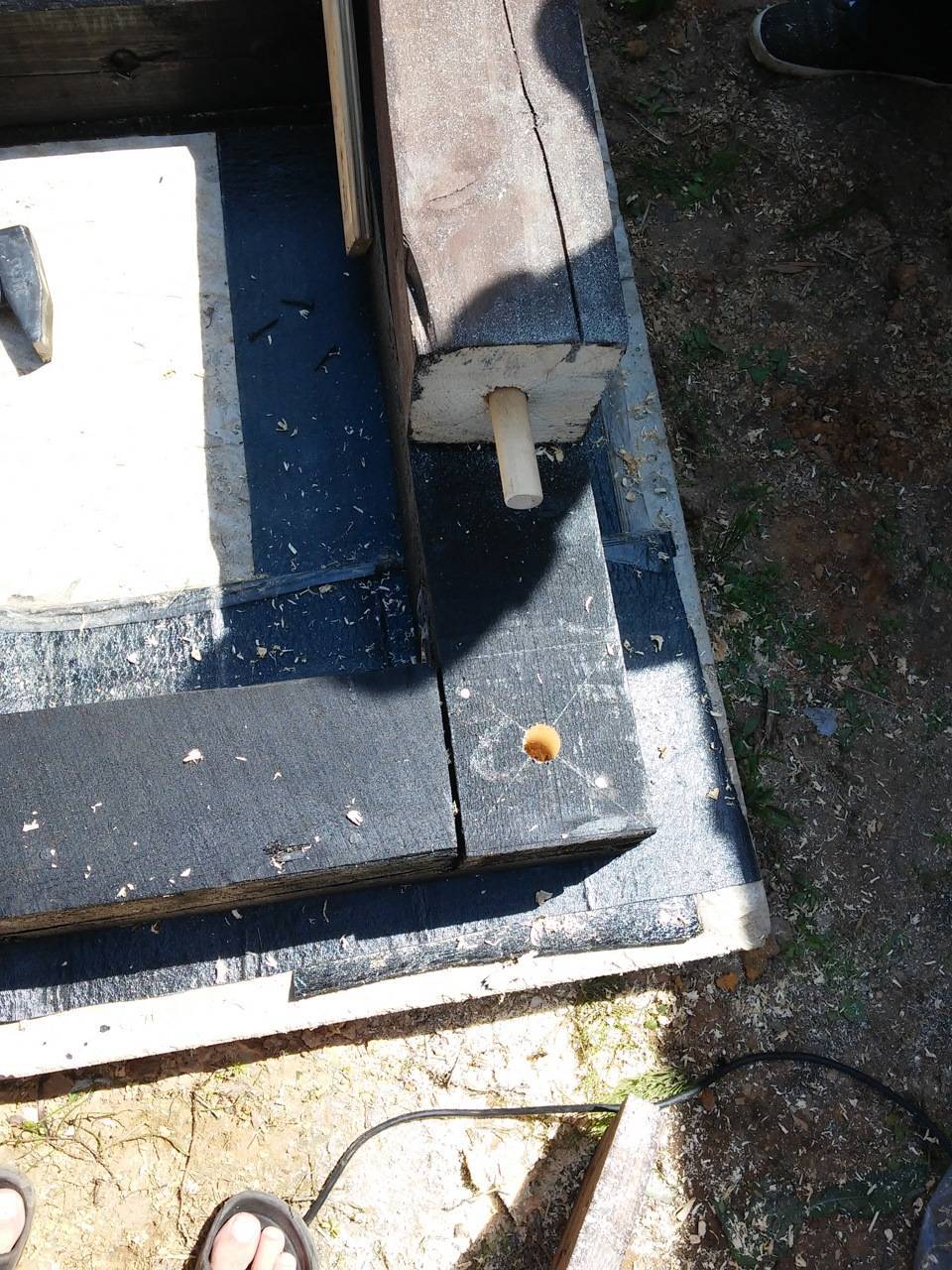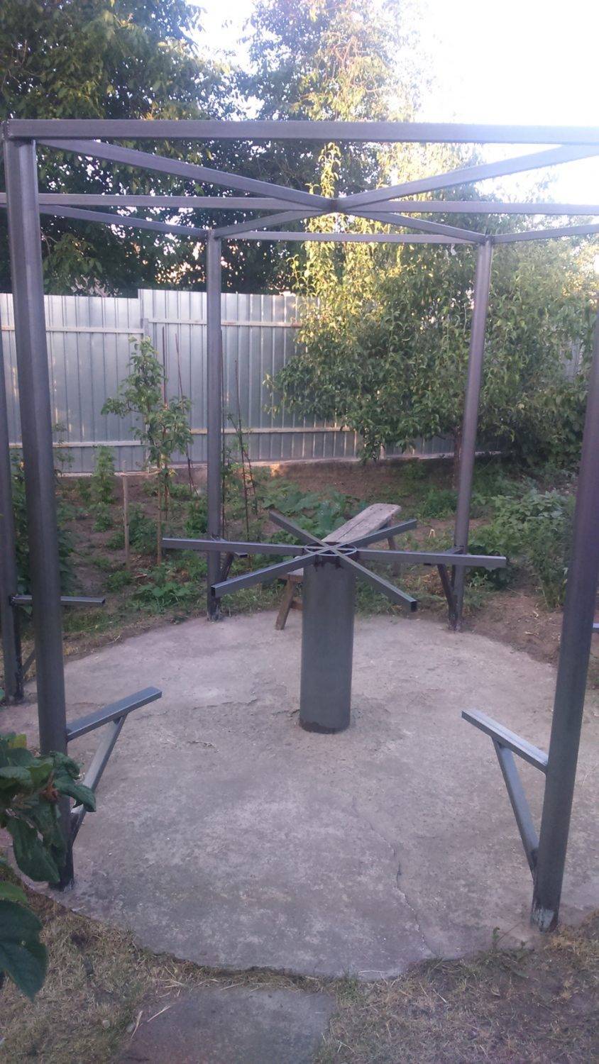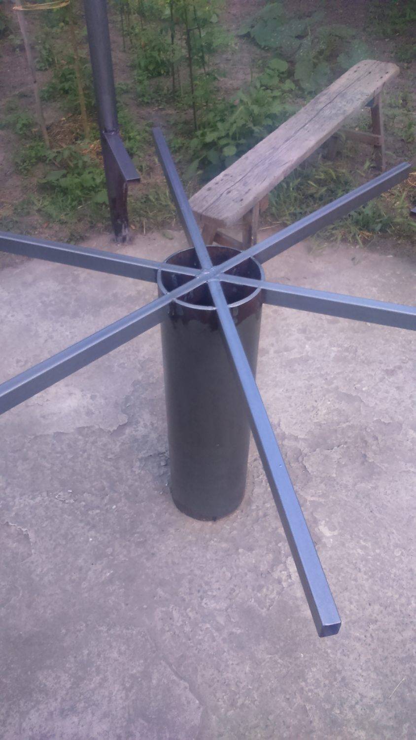 Если вы все сделали верно, то крышка плотно станет на приготовленную «ножку». Останется только закрепить ее на своем месте шурупами и вы получите для беседки отличный стол.