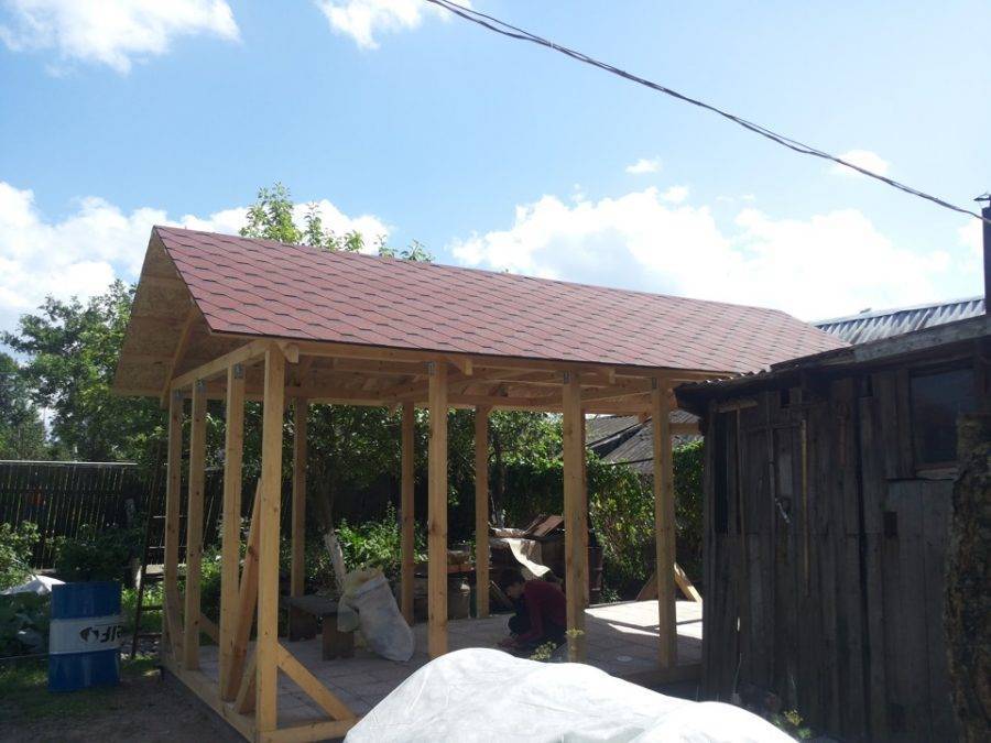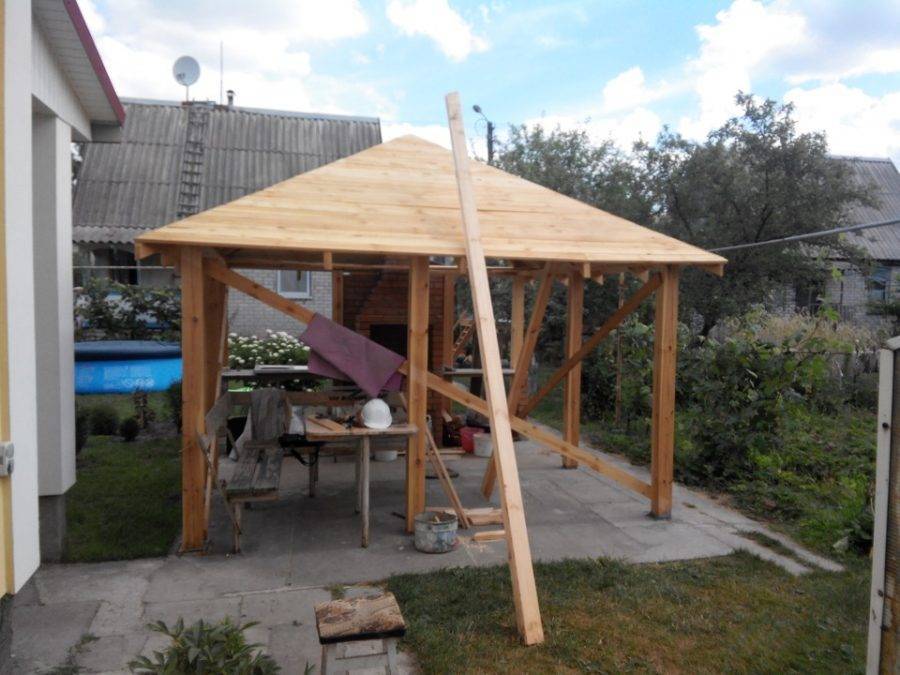 Последний штрих беседки – кровля. Можно пойти по самому простому пути, использовав односкатную или двускатную конструкцию, под углом наклона не больше 15-ти градусов. Чтобы цена не кусалась, а поддоны и так обеспечили очень экономичный вариант постройки, можно положить на крышу шифер.