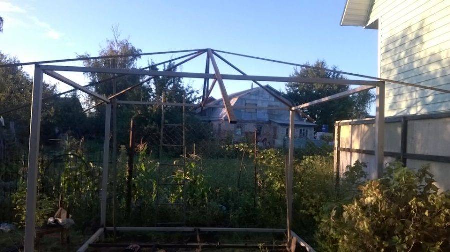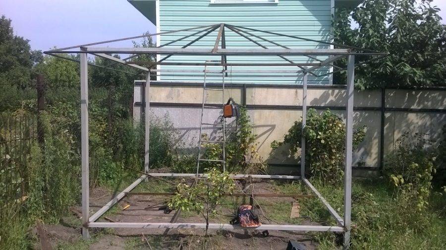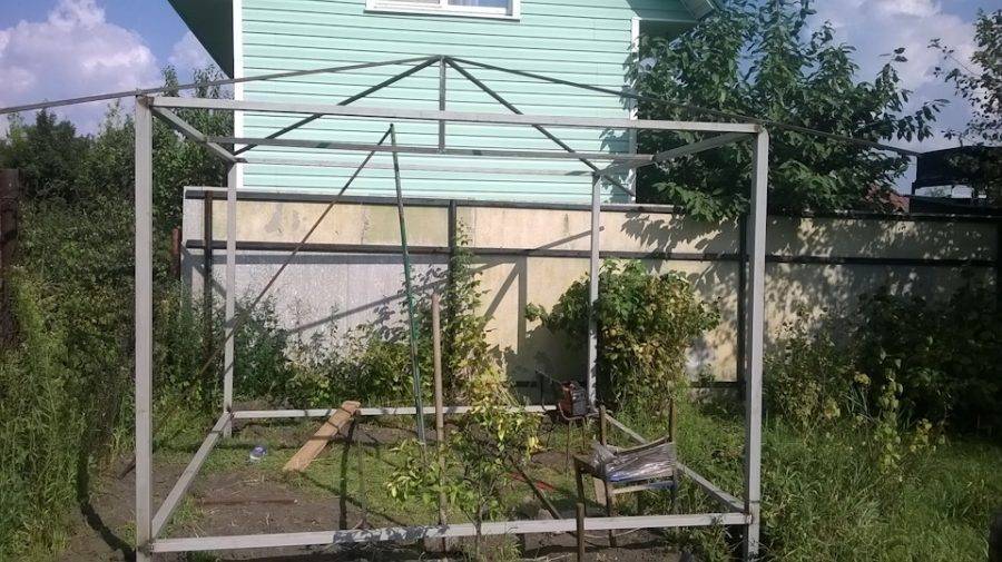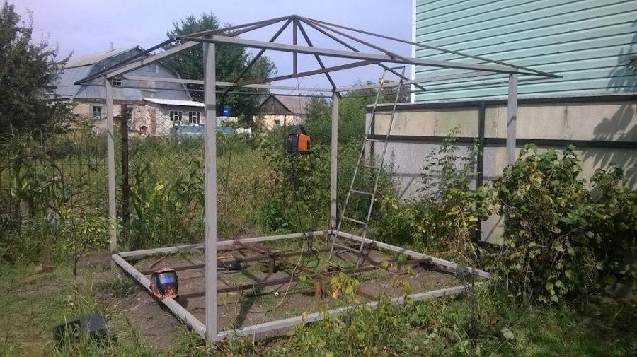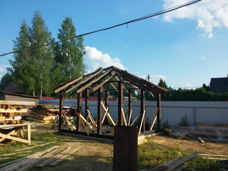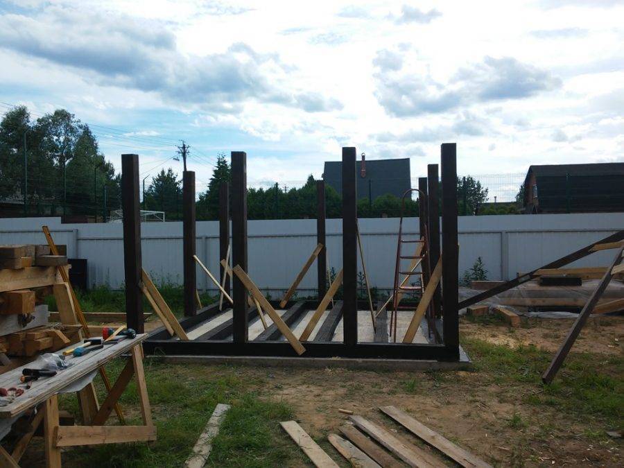 Следующий этап – монтаж каркаса, как это показано на видео. От конструкции каркаса зависит будущий вид беседки, построенной своими руками на даче. Постройка бывает нескольких типов: