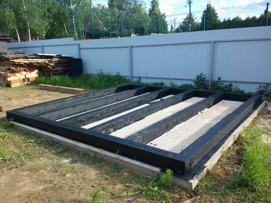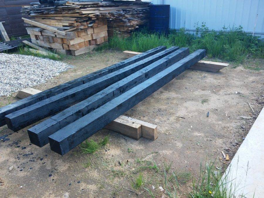 - После застывания бетонной смеси нужно вставить стоечные брусы. Их заранее обрабатывают битумом.