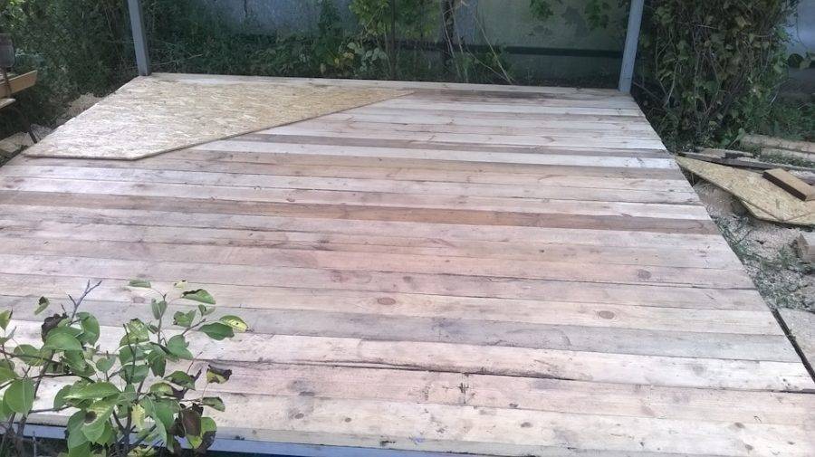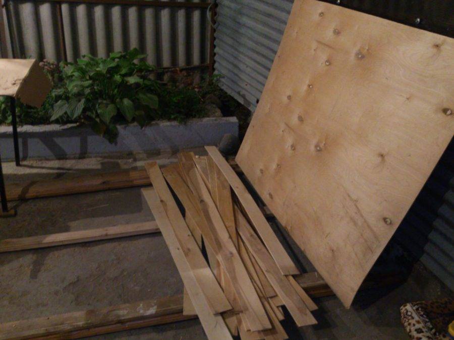 Потом полностью разобрать уже существующий настил и, добавив туда несколько досок из разбитых паллетов, собрать на его месте сплошной щит с выступающими на четыре сантиметра краями.