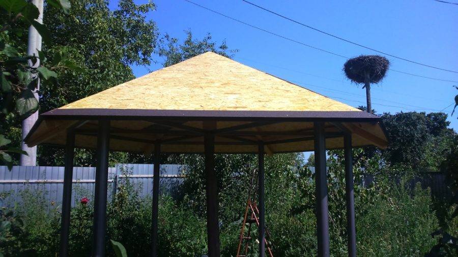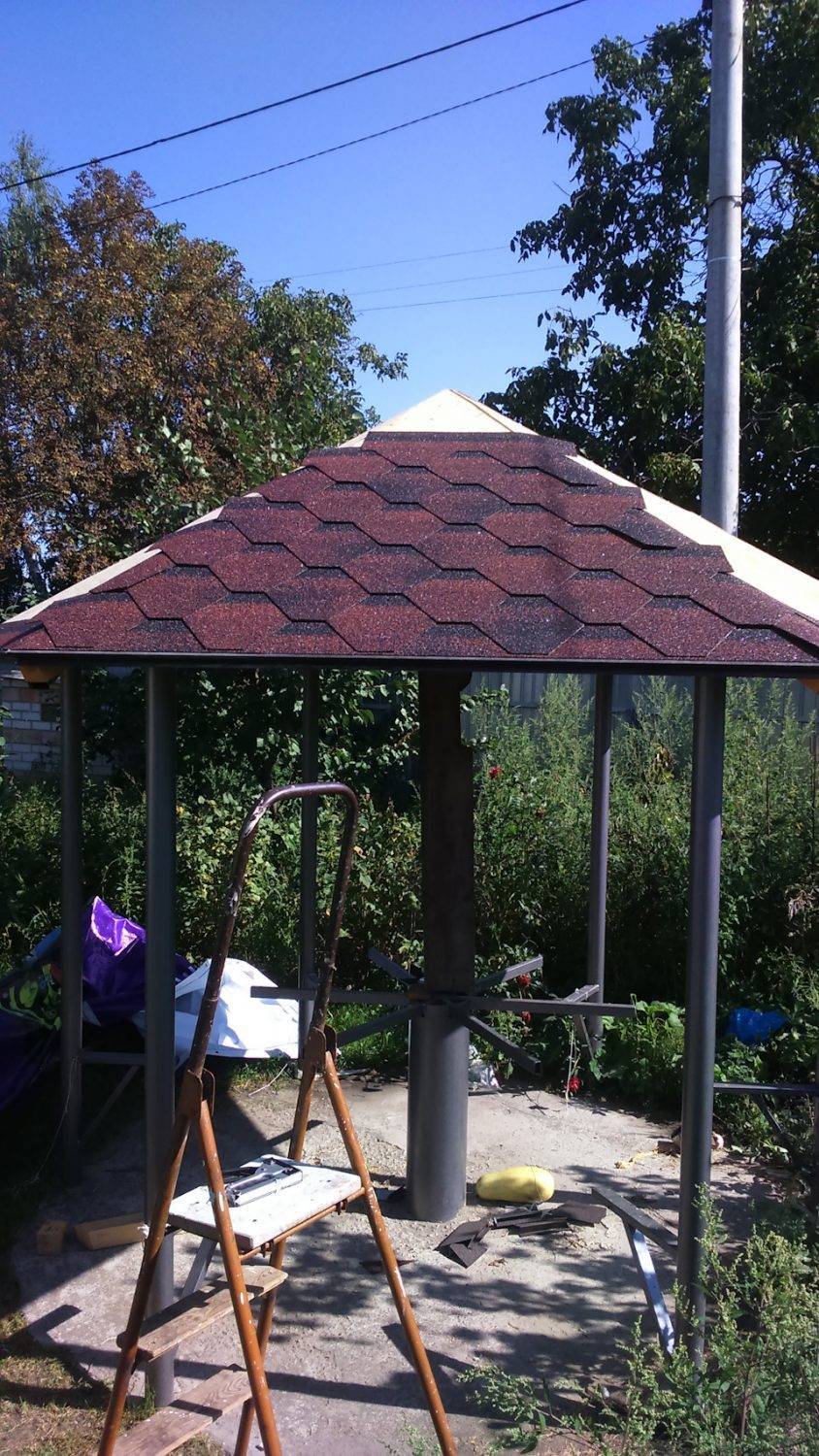 - Крышу самодельной беседки на дачном участке проще всего сконструировать из поликарбонатных листов. Если же поликарбонат кажется слишком простым и скучным, то вместо него можно воспользоваться гибкой черепицей, ондулином или металлочерепицей.