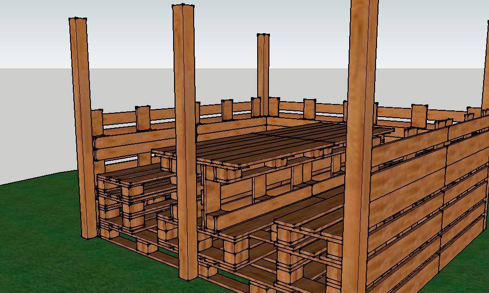 - Три стороны закрыты. Поддоны идут в два слоя, и остается открытой только четвертая часть строения. Совсем мрачный вариант.