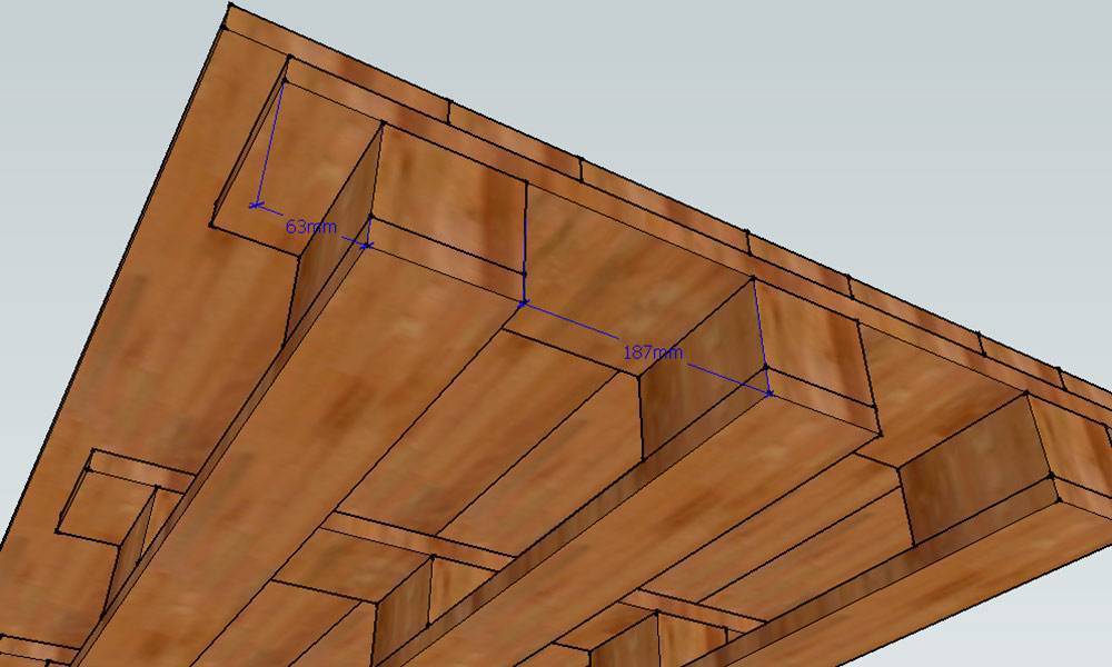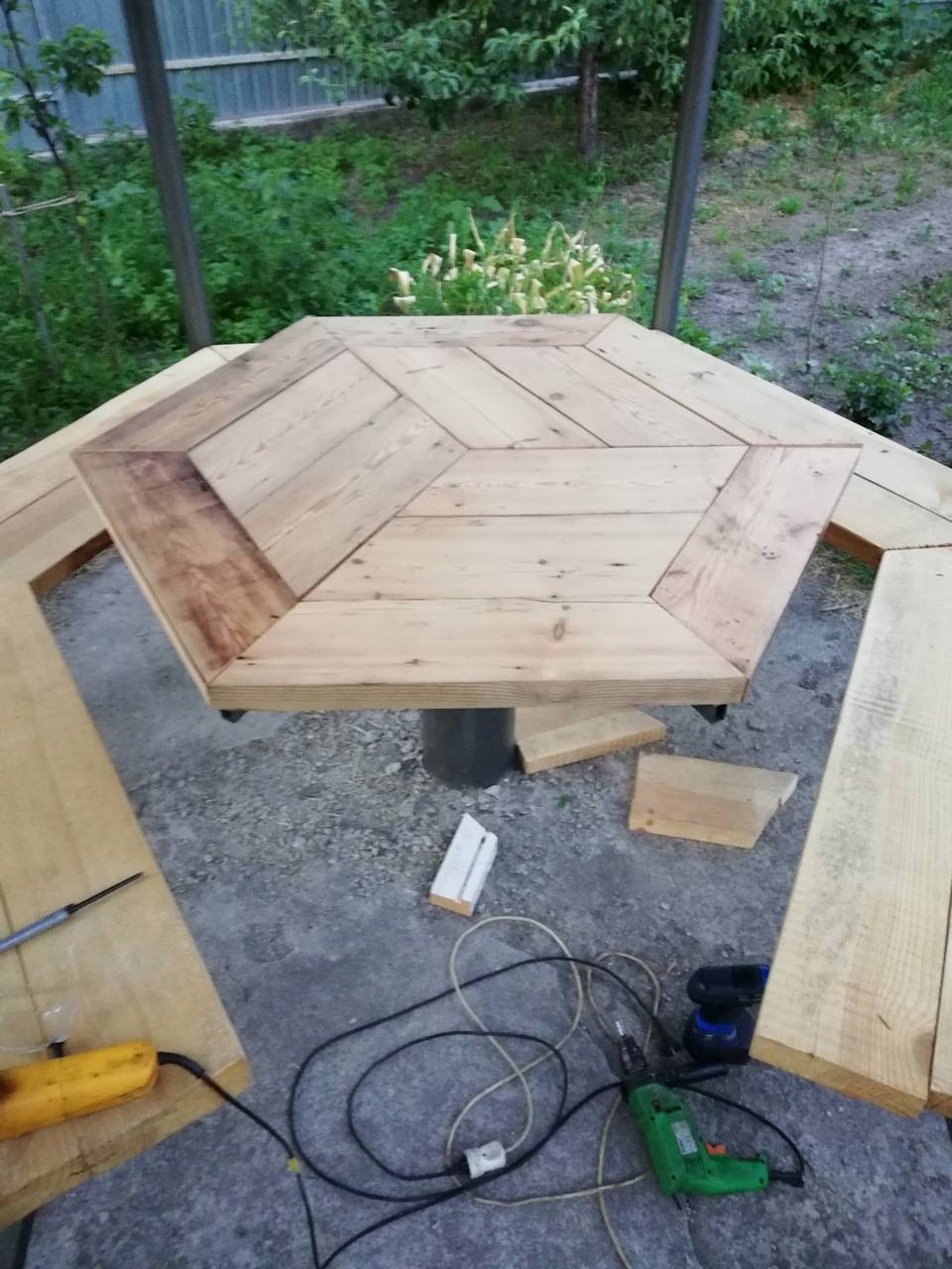 Внимание! Не забывайте, не только скручивать детали между собой, но прихватывать их к другим элементам беседки. Чтобы изготовить крышку для стола, нужно выбрать еще четыре добротных поддона и перенести их крайние ножки на 63 мм ближе к центру