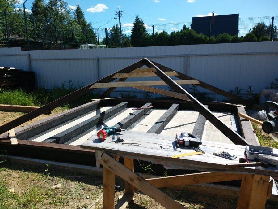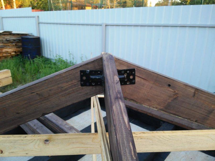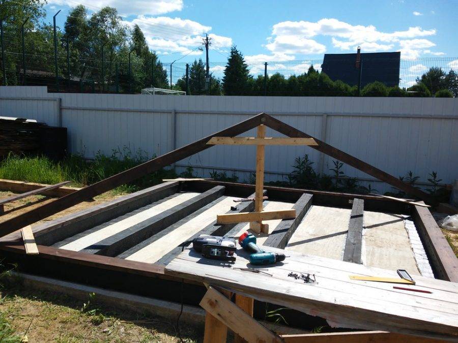 - Собираем крышу из стропил и конькового бруса. Наружную сторону стропил обшиваем фанерой и на неё прикрепляем кровельный материал.