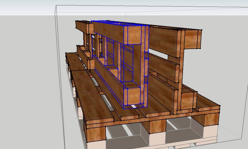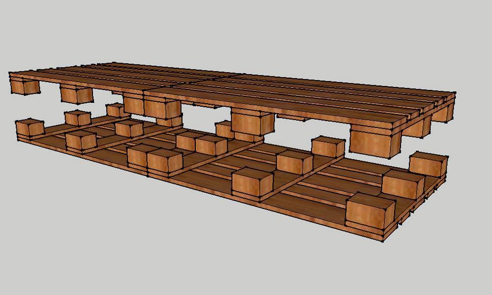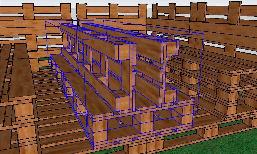 Чтобы его построить принесите еще 4 паллета и освободив их от лыж соедините получившиеся элементы между собой согласно следующей схемы.