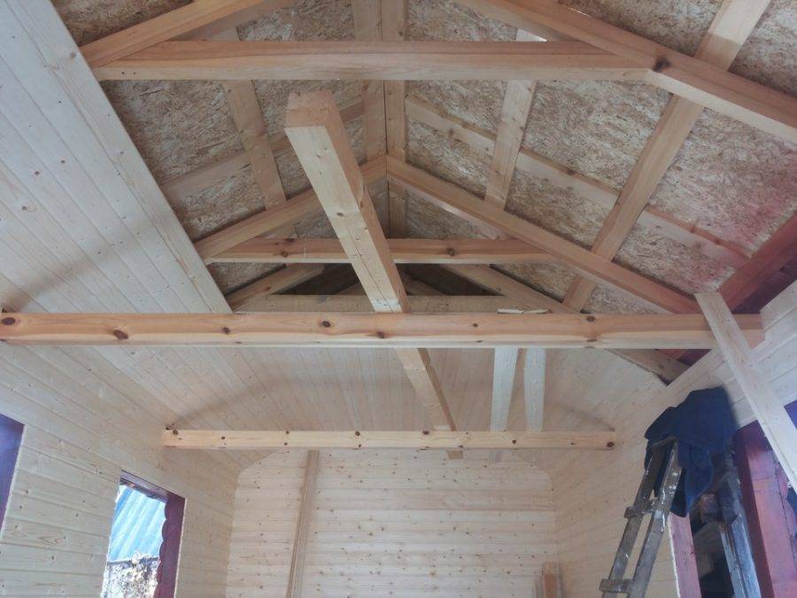Стойки и стропила распределяются примерно через каждые 60 см, чтобы можно было интегрировать любую изоляцию и поместить внутреннюю панель (например, плиты толщиной 12 мм). Очень часто легкая кровля состоит из гонта (битумной черепицы). Деревянный каркас служит опорой для внешней облицовки.