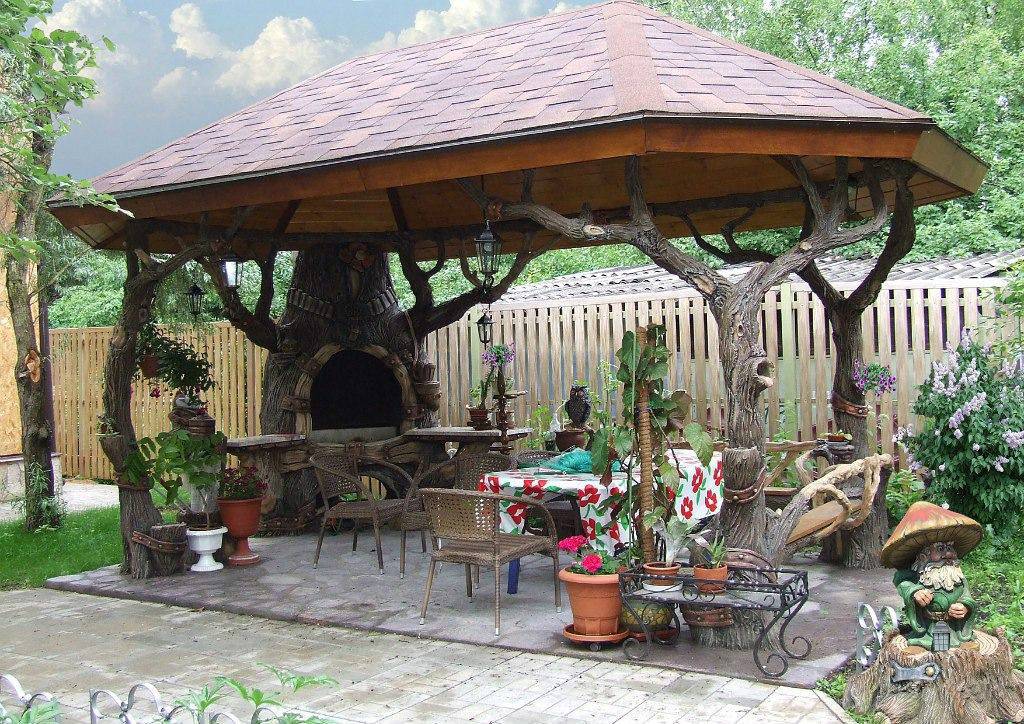 Интересно будет смотреться сооружение, выполненное из необработанных стволов, соединённых при помощи веток. Такая беседка будем иметь вид как в сказках.