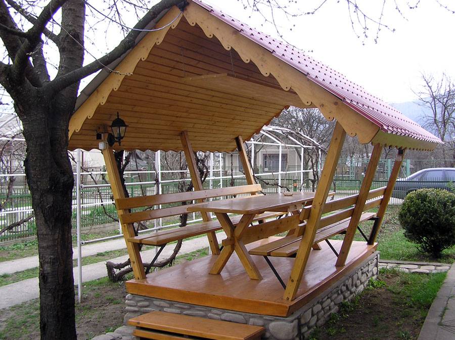 Вот пример такой беседки. Очень неплохой и простой в исполнении вариант.