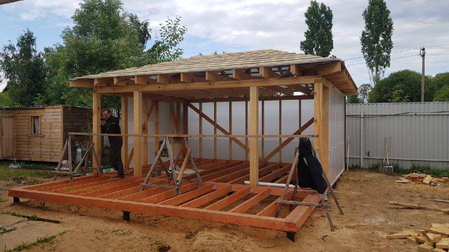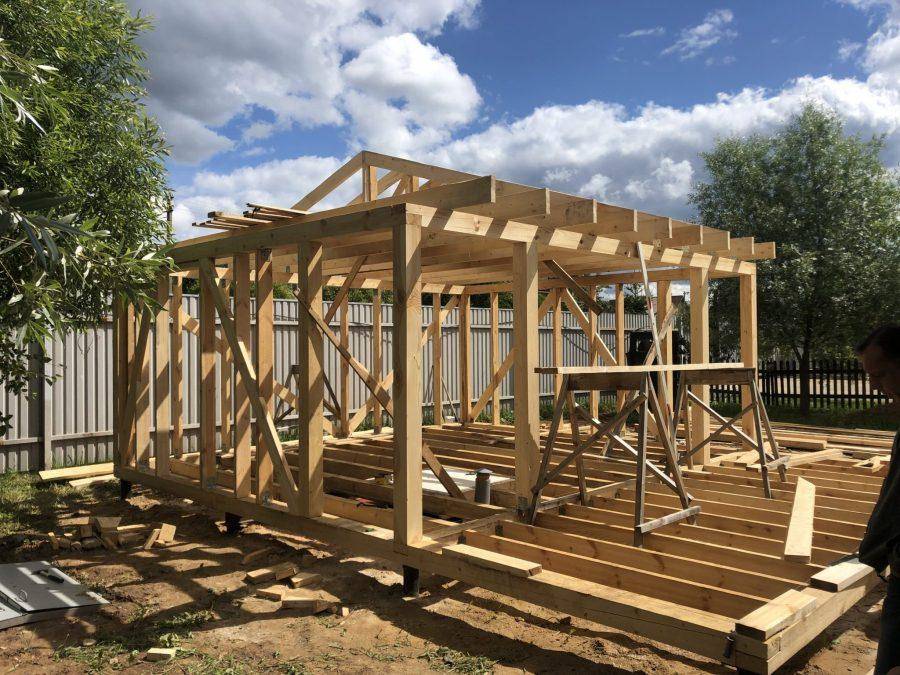 После установки боковые опоры соединяют между собой досками 50х150 мм, а затем монтируют раскосы для стропил. На высоте 10 см и 0,5 м от пола стойки соединяют горизонтальными перемычками из бруса 50х50 мм. Между перемычками крепят вертикальные бруски с шагом 40 см. Дверной проем оставляют свободным. Все крепления осуществляют с помощью болтов и стальных уголков, которые прикручивают к дереву саморезами.