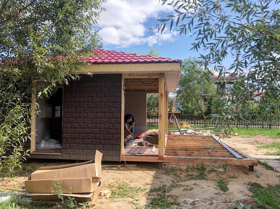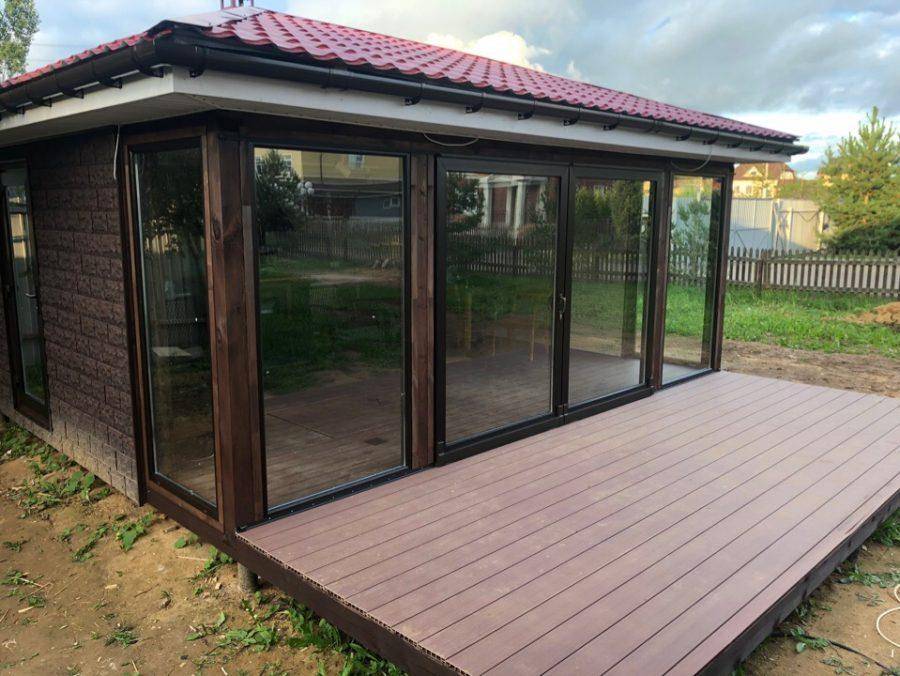 Пол выкладываем из ДПК — террасной доски на основе древесно-полимерного композита. Оставляем между ними технологические зазоры, которые предупреждают накопление влаги и способствуют вентилированию.