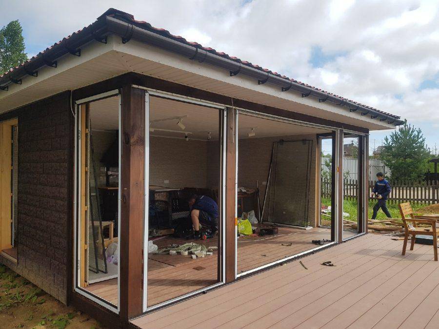 После того, как установлена кровля, можно немного отдохнуть и расслабиться – теперь беседка защищена от дождя. Отдохнуть – это значит установить стол, стулья и поджарить первый шашлык на мангале. Окна и двери могут подождать и до осени – все равно требуется время для усадки. За это время можно сделать все работы снаружи – покрыть стены лаком или краской, посадить вокруг беседки декоративные растения.