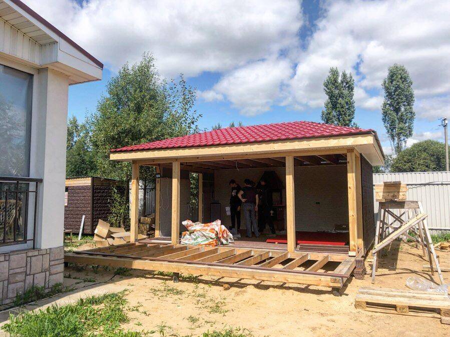 По периметру и между собой столбы по оголовкам стягиваем брусом с сечением 100*100 мм, обвязка послужит мауэрлатом, на который и будет опираться вся стропильная система. Схема типовой крыши представлена на картинке выше, добавим, что стропильные ноги лучше делать из обрезной доски 100*40 мм. В зависимости от вида кровли выполняется обрешетка, это может быть рейка из дерева сечением 40*20 мм или влагостойкая фанера. Выбор кровельного материала определяется дизайном конструкции с учетом бюджета, но крыша не должна быть слишком тяжелой, чаще всего используют профлист или мягкую битумную черепицу.