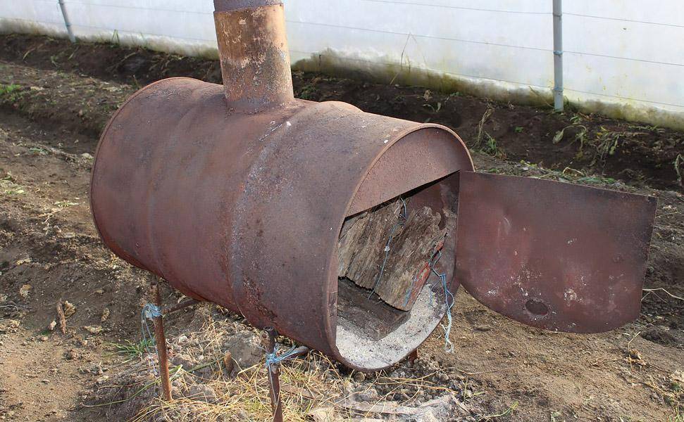 Дровяная печурка делается из железной бочки, объем которой составляет 150-200 литров. В ее верхней части делается небольшая полость, через которую будет выводиться дымоход. Для улучшения тяги и выведения продуктов сгорания в качестве дымохода используют трубу диаметром 20 сантиметров.