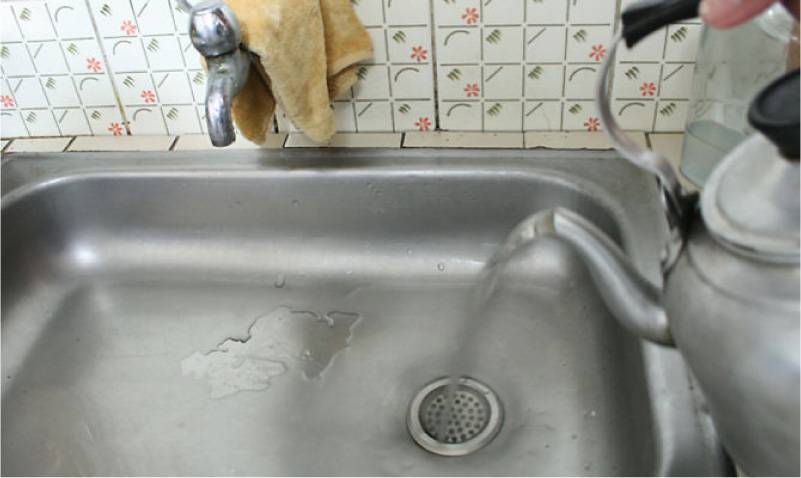 - Нагрейте в чайнике воду и лейте кипяток прямо в слив. Это моментально устраняет сальные наслоения. Способ подходит при условии, что в доме металлические и чугунные трубы. Если у вас система сделана из пластика, такой метод не подходит. Это может расплавить и деформировать трубу.