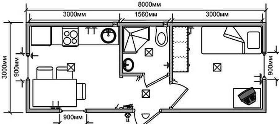 Так что если есть возможность, наружную ширину желательно увеличить до 3,5 метров. С точки зрения эксплуатации это удобно, а вот экономически невыгодно. Дело не только в увеличении количества требуемых материалов. Оно увеличится, но не очень значительно. Дело в большом количестве обрезков, которые при этом получатся. Стандартная длина досок и бруса — 6 метров. Так что оптимальный размер 3 на 6 метра. Но, как выяснили, он не очень удобный. А при длине бытовки 8 метров, остаются куски по 4 метра. Так что второй оптимальный размер, который должна иметь дачная двухкомнатная бытовка с туалетом и душем — 8*4 метра. В этом случае количество обрезков будет очень незначительным. Так что расходы не слишком возрастут.