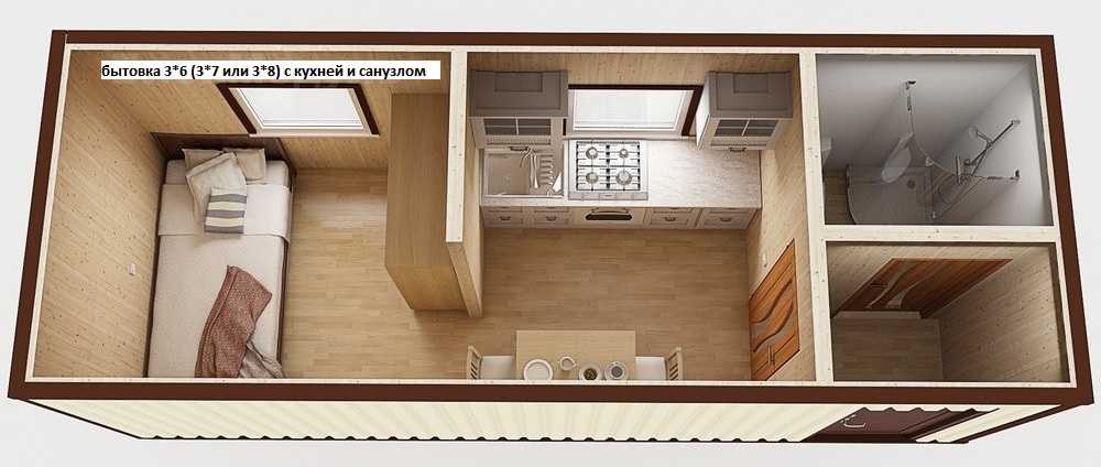 Нормальная ширина бытовки — 3-3,5 метра. При такой ширине комнаты получаются функциональными и удобными. Даже если длина бытовки 6 метров, можно выгородить в средней части туалет с душем, а по бокам расположить комнаты.